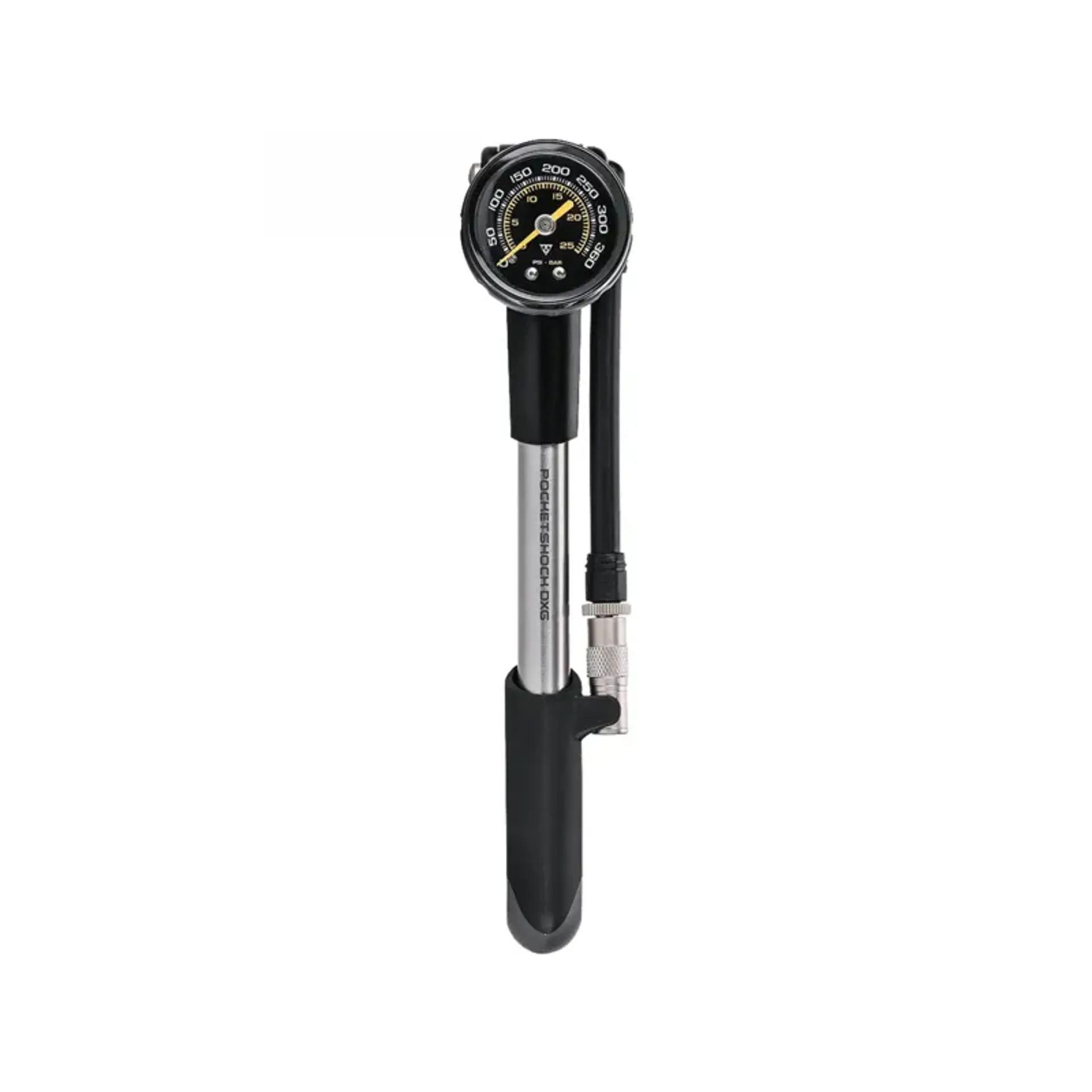 A precision fork and shock pump with an easy to read gauge for accurate pressure readings up to 360psi.